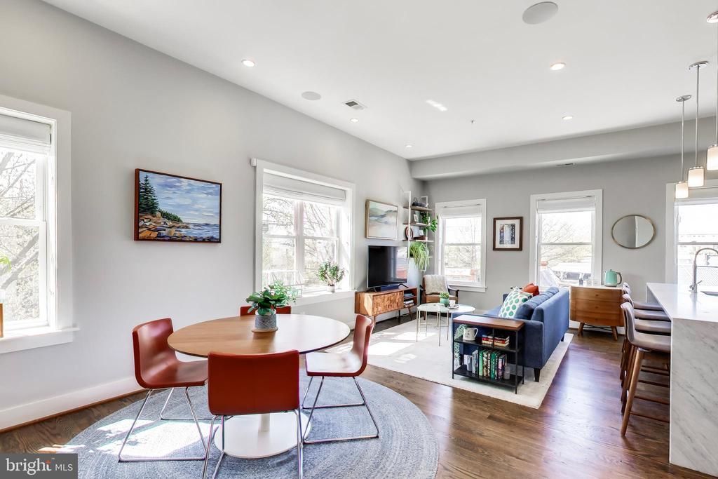 Stunning 3BR/2BA penthouse condo with an amazing rooftop deck - possibly the largest private deck in all of NW DC - measuring 46' x 21'! Modern elegance surrounds you in the thoughtfully designed home with exposures in three directions providing endless natural light. Rustic wide-plank hardwood flooring warms the generous, open layout with 10 foot ceilings. The gourmet kitchen is a home chef’s dream with waterfall marble counters, stainless steel appliances, gas cooking, custom cabinetry and separate pantry closet. Retreat to your peaceful owner’s suite with balcony access, walk-in closet, and opulent marble bath with glass shower and dual vanity. Two additional generously sized bedrooms with custom closets offer space for family, guests, or home office(s). A second full bath with tiled tub/shower allows for easy access for guests. Up the interior staircase, you'll find an interior wet bar and wine fridge on your way to an absolutely stellar rooftop deck spanning the entire top floor, easily becoming your favorite spot to relax and entertain. In-home laundry, ample assigned storage, and underground covered parking round out this amazing pet-friendly home. Low condo fees and a thoughtfully self-managed 3-unit condo association allow for low drama living. Just blocks away from the Petworth Metro Station, Safeway, Starbucks, Honeymoon Chicken, Upshur Pool & Recreation Center, Red Derby and more! Pet Friendly, Rental Friendly building. New HVAC - 2024. New Dishwasher - Bosch - 2024. Custom top down blinds on most windows installed in 2021.